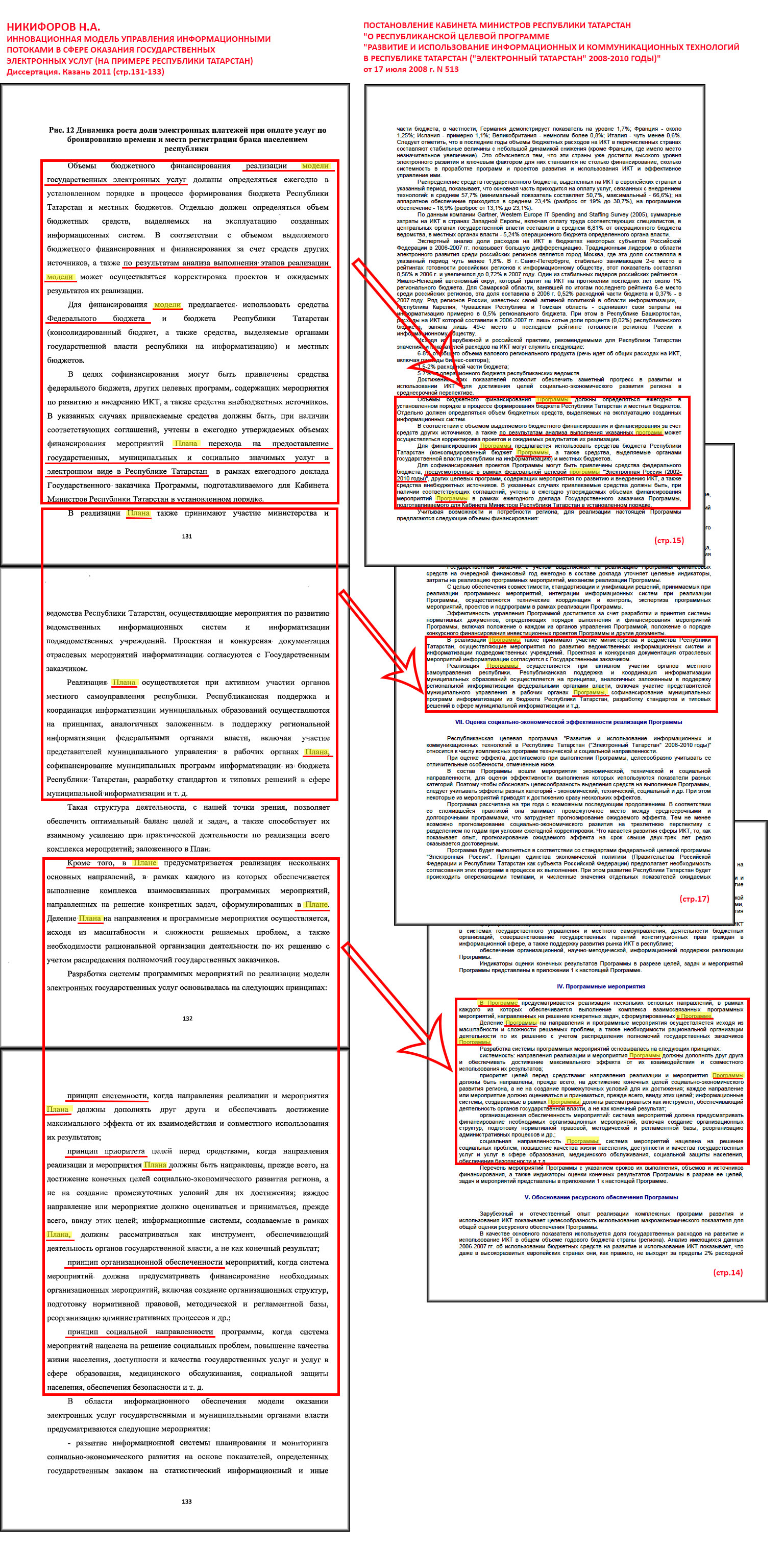 Но вот что уж открывает самые богатые возможности для раздольного, размашистого "заигошивания" - это официальные государственные документы нормативного характера. Тут прямо можно текст чемоданами грузить. Тем более, что через руки госчиновника проходит огромное количество всяких многотомных и многотонных бумаг, так что выбор тут поистине колоссальный. Особенно приглянулось изготовителям министерской диссертации одно постановление правительства Татарстана на тему, сходную с выбранной для Николая Никифорова: про республиканскую программу "ЭЛЕКТРОННЫЙ ТАТАРСТАН" на 2008-2010 годы. Этот товар уже можно было кроить ломтями по три страницы подряд: