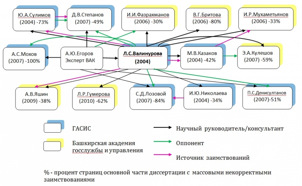 Аспиранты профессора Валинуровой нередко использовали для написания своих работ тексты диссертаций своих предшественников, подготовленных под ее же руководством. Для оппонирования диссертаций с массовыми некорректными заимствованиями приглашались свои люди: бывшие аспиранты, либо участники фабрики. Например, у Э.А. Кулешова оппонентом выступила А.В. Гукова, а А.Ю. Егоров стал оппонентом А.А. Фазрахманова.