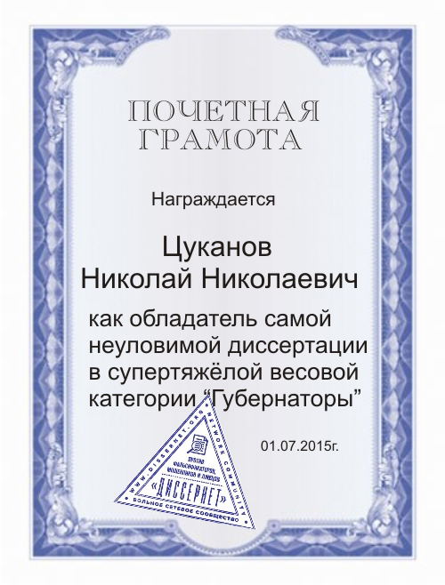 «Диссернет» учредил для г-на Цуканова Почетную грамоту за обладание самой неуловимой диссертацией. Награда вручается в супертяжёлой весовой категории "Губернаторы".