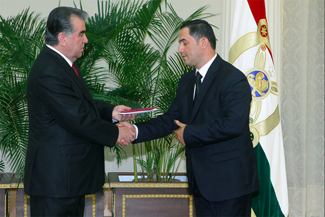 Президент Таджикистана Эмомали Рахмон вручает премию им. Исмоила Сомони в сфере гуманитарных наук кандидату педагогических наук Ахмадшо Рахматшоевичe Саидовe (2015).
